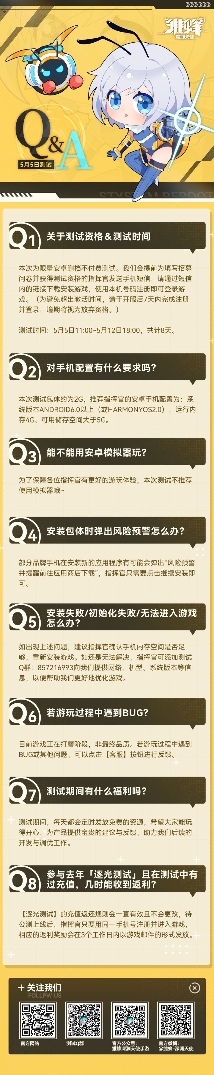各位指挥官:大家好,我是你们的AI引导人形——爱丽丝。5月5日限量删档不计费测试在今天正式开启啦~ 我和小琉璃为大家准备了一份测试相关Q&A手册,希望能帮助有疑问的指挥官们。十分感谢指挥官对产品的支持,如对本次测试还有其他疑问,请在本帖中留言,我们将会尽快解答大家的问题。
