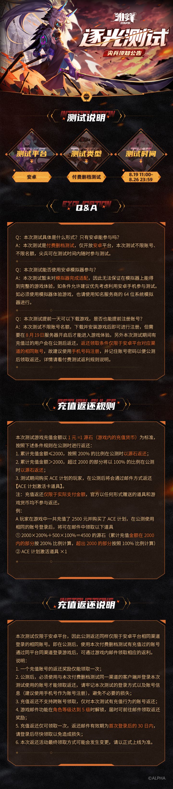【逐光测试】安卓不限量测试开启,充值返利规则说明