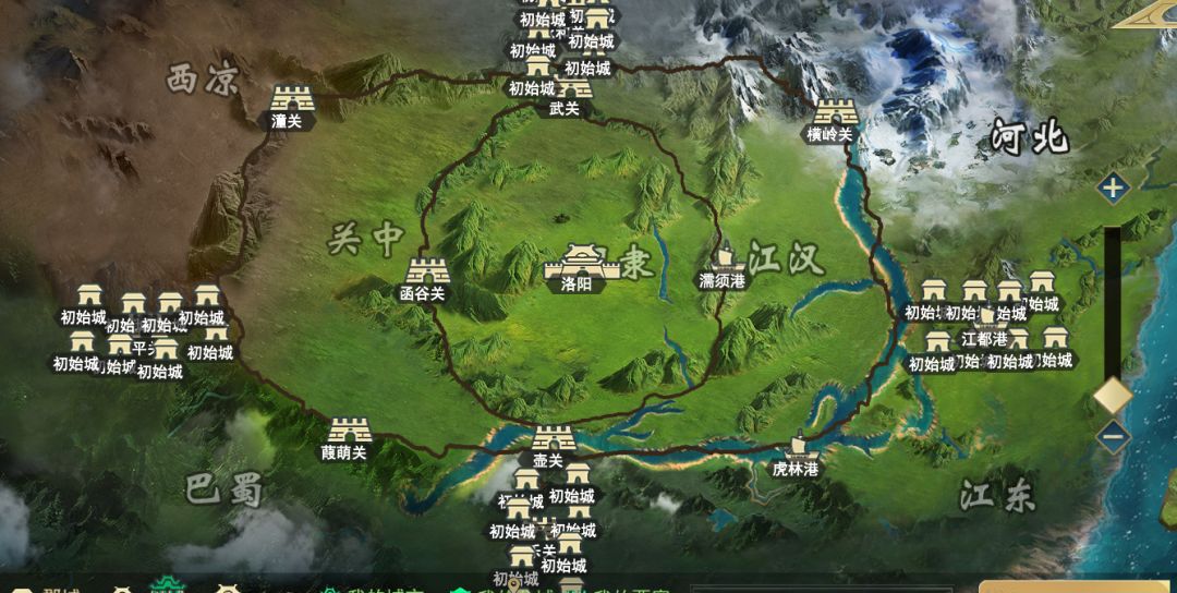 由不同的城池区域和地貌组合而成。每一座城池都拥有所属区域范围。在地图上,山水的区域是部队无法通过的区域。除此之外,每个州都由关隘进行阻断。玩家需要通关关隘后,才能进入其他的州。 地图整体是由四个初始州,两个资源州和一个中心州组成的,玩家主要的行军路线从外围逐步向中心推进的趋势。 每座城池有自己的区域范围,每座城池和城池之间相邻,由城池地界线分割。玩家需要通过占领相邻城池的方式,逐步推进路线,最后完
