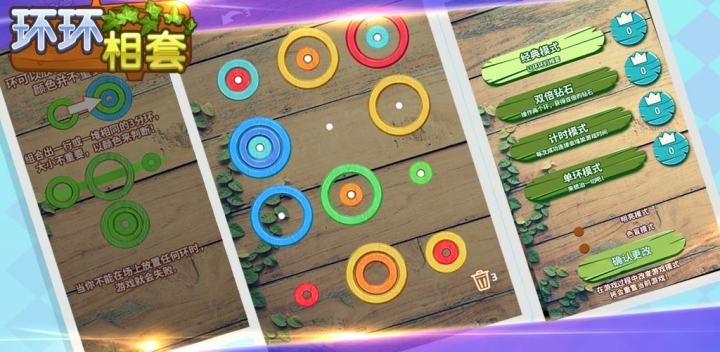 《环环相套》是一款套环消除游戏,玩家需要切换颜色 环上的九分之一栈板,一个点最多可以叠加3个不同大小的环,颜色不影响放置。