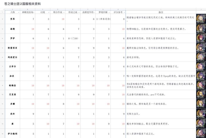 国服角色评分表(更新索菲)