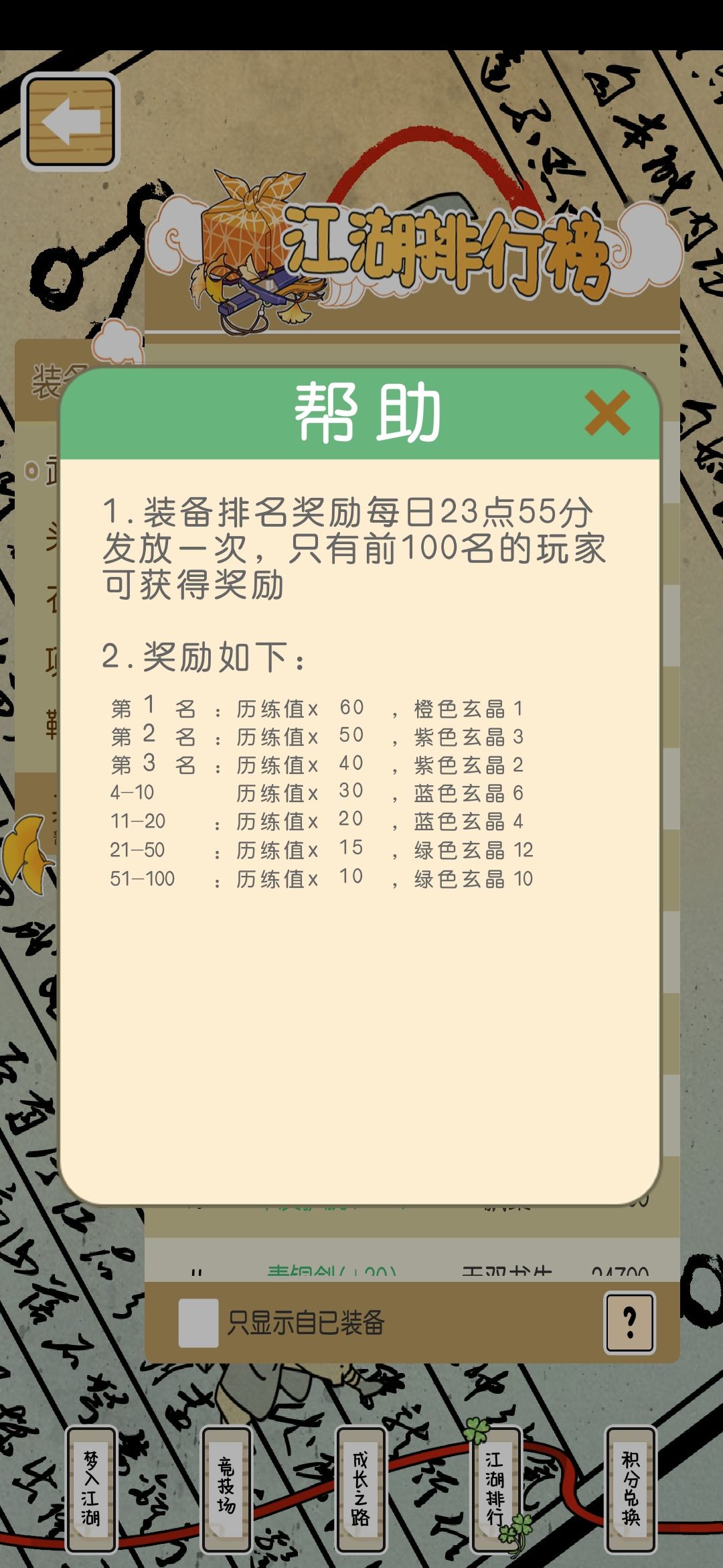 装备是江个湖中很重要的一个环节,也是较有特色的一部分。它不仅像其它游戏一样可以提供战力的加成,更重要的是玩家可以通过装备的排名(通过历练中的江湖排行查看)获得每日奖励,内容见图:第一名可以获得60历练和一个珍贵的橙色玄晶,前三可获得紫色玄晶,前二十可获得蓝色玄晶,前一百可以获得绿色玄晶。为了实现日后的以战养战,我们进入游戏的第一天就应该考虑对装备的养成和积累。 装备的大体介绍如下图: 分为武器,头