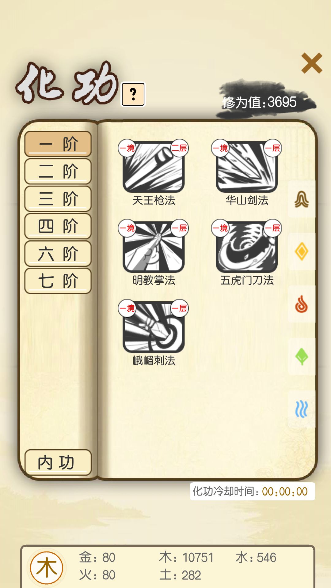 这个游戏是一个不太肝的养成游戏。根据教程推进,你会得到一个一阶技能华山剑法以下是我一阶所得到的技能。(最右方密室可查看) 根据右下角指引进行升级,当然,你会有卡级的时候比如 这时你就要升级了,那么你就要出行来获得经验,前期金币可以攒着,那么就是最低配,但是获得的武学也不会高级。如果你是最高配也许可以拼一拼,比如下面这样 同时也会出现一个麻烦的事情,那就是你会发现没金币了。这是不用着急,可以进行手机