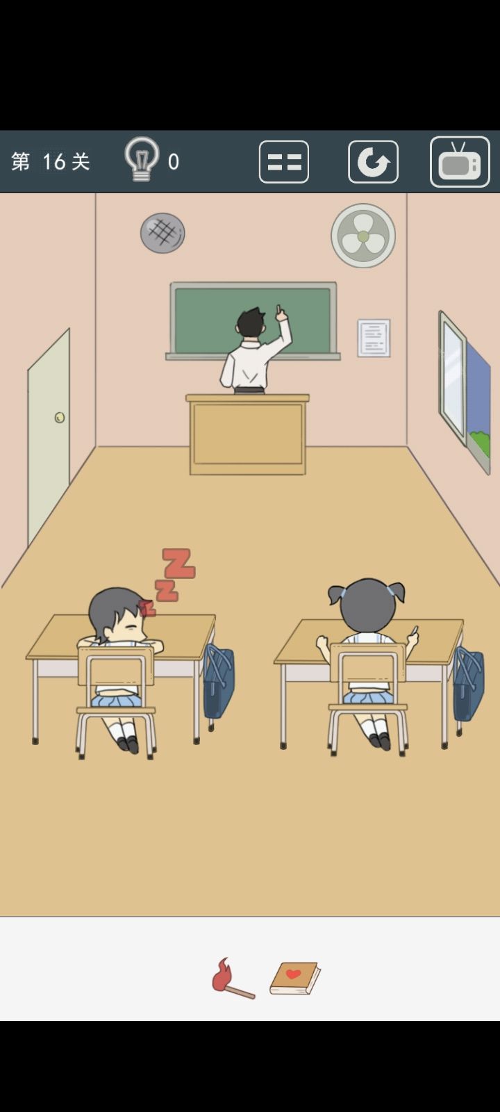 12.最上边找月球,点三次拿到老鼠🐭,往被子里放老鼠。13.可以把伞🌂扔了(多转几圈吧😂)太阳☀也可以,被子也是。14.卫星上拿到螺丝刀,可以把火箭🚀后面的灯取下,再按到卫星上灯会亮。15.(emmmm有点迷胡点点过的)从书包拿钱💰,放门口,会吸引来一个女老师?这是再放花开风扇就可以了。16.门上可以取下一块砖,用来遮住下课铃,然后放火烧窗外(火打开门找到),再点点那个火就可以了17.云