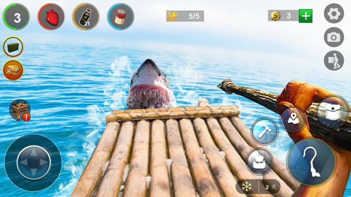 在游戏中!你发现自己独自一人在海洋中徘徊的小木筏上。附近没有陆地的迹象。你看到路过的各种碎片让你意识到你是海难中唯一幸存者!如果你想要生存,现在你需要为生命而奋斗!饥饿的鲨鱼总是靠近你的木筏,等待着你倒下,所以你要小心!专注打造自己的基地,保护它免受鲨鱼袭击并探索周围的广阔世界。