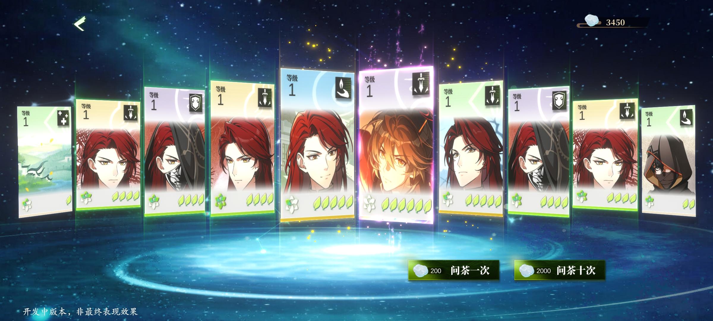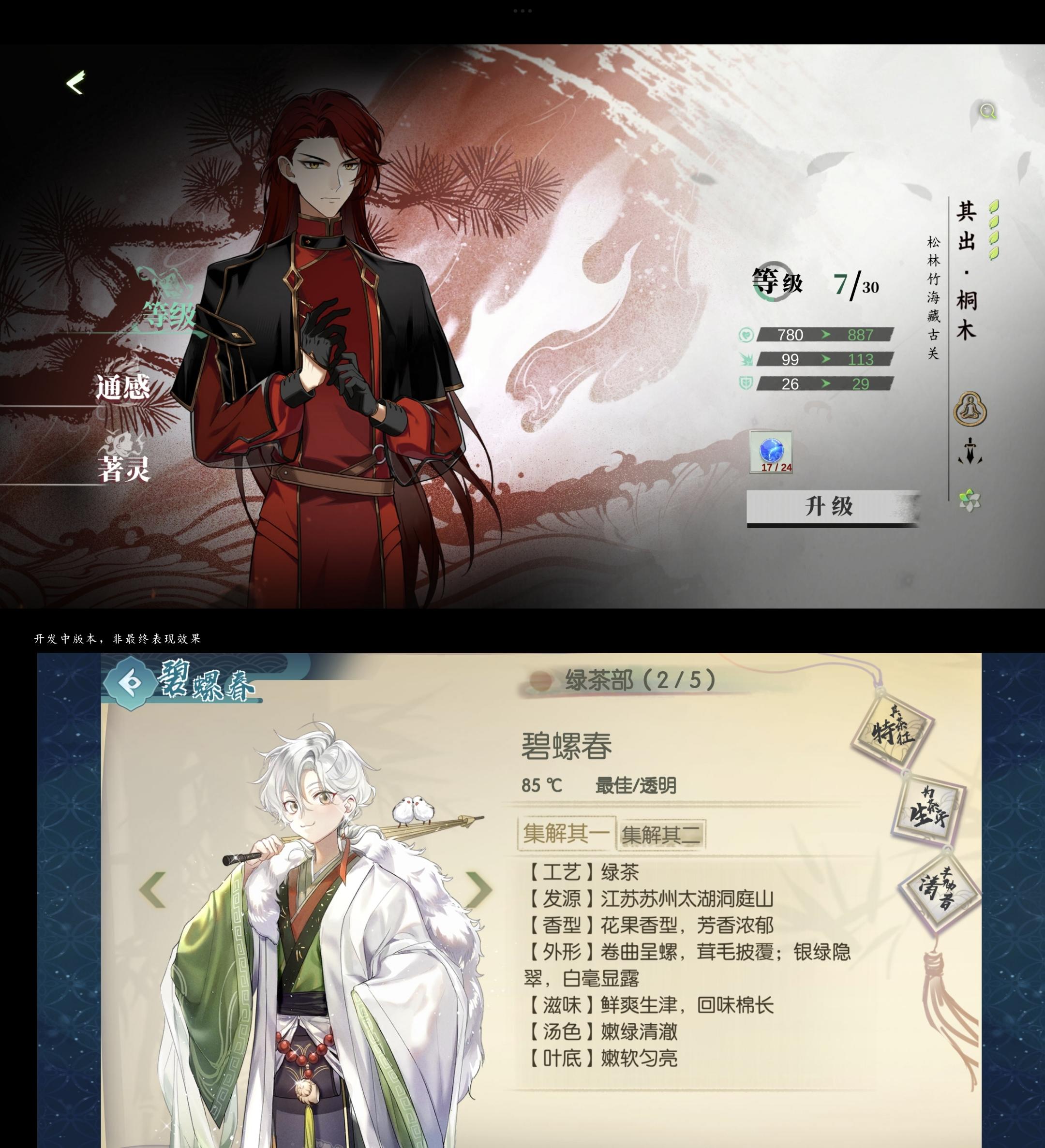 能看出来还很简略,目前的玩法已有雏形,但是福利和数值还未确定。剧情还可以,讲述“我”无意中得到《本草纲目》,躲避杀人越货的反派,并在此过程中结交各种茶灵,寻找《本草纲目》前主人的故事。未开放各种茶的专属故事。“我”还是挺冷静的人设啊。画风如图,也不错。UI设计仍需优化,主页面没截图,整体布局还可以。抽卡的结算页把卡面放大一点吧,卡的边框占比不需要那么多。还有字体大小的问题(特别是)最后一张图