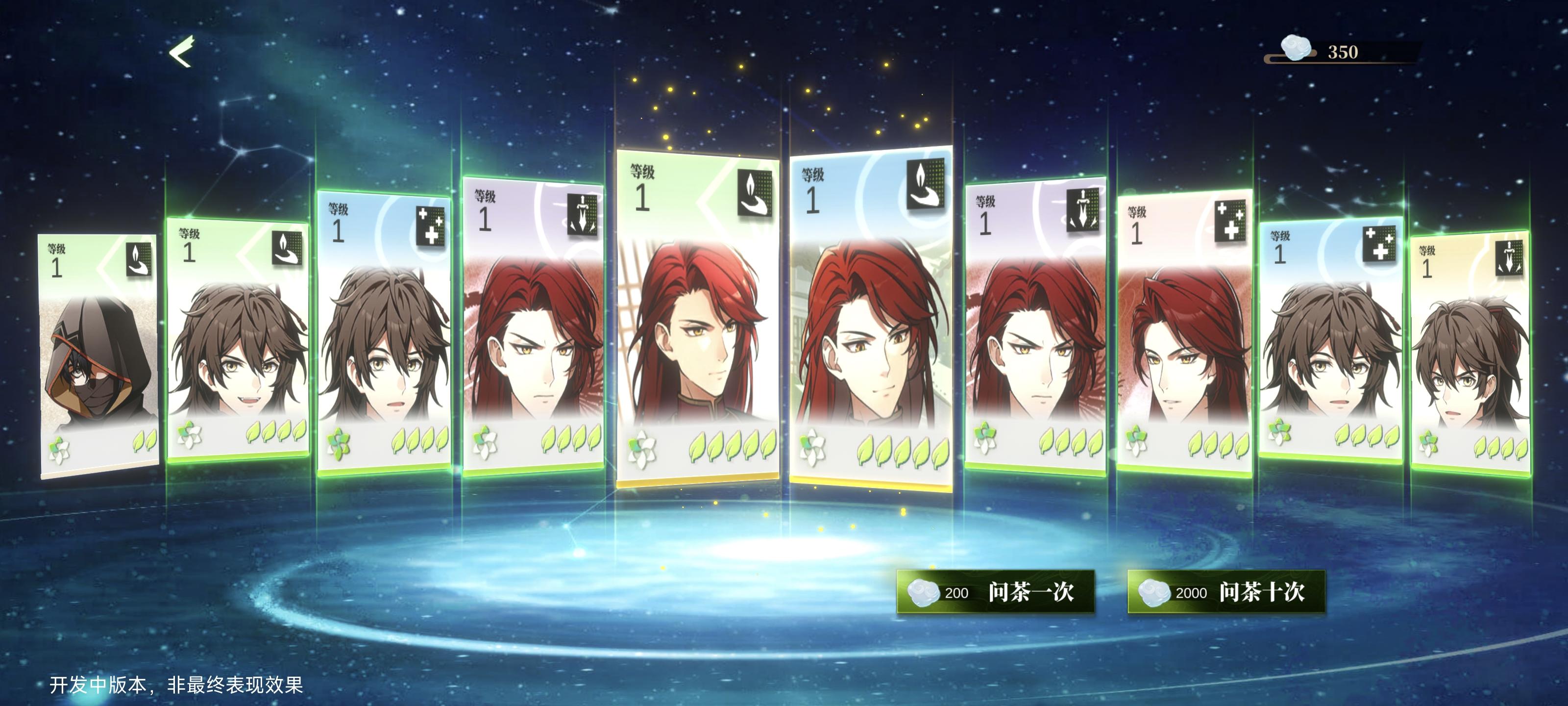能看出来还很简略,目前的玩法已有雏形,但是福利和数值还未确定。剧情还可以,讲述“我”无意中得到《本草纲目》,躲避杀人越货的反派,并在此过程中结交各种茶灵,寻找《本草纲目》前主人的故事。未开放各种茶的专属故事。“我”还是挺冷静的人设啊。画风如图,也不错。UI设计仍需优化,主页面没截图,整体布局还可以。抽卡的结算页把卡面放大一点吧,卡的边框占比不需要那么多。还有字体大小的问题(特别是)最后一张图