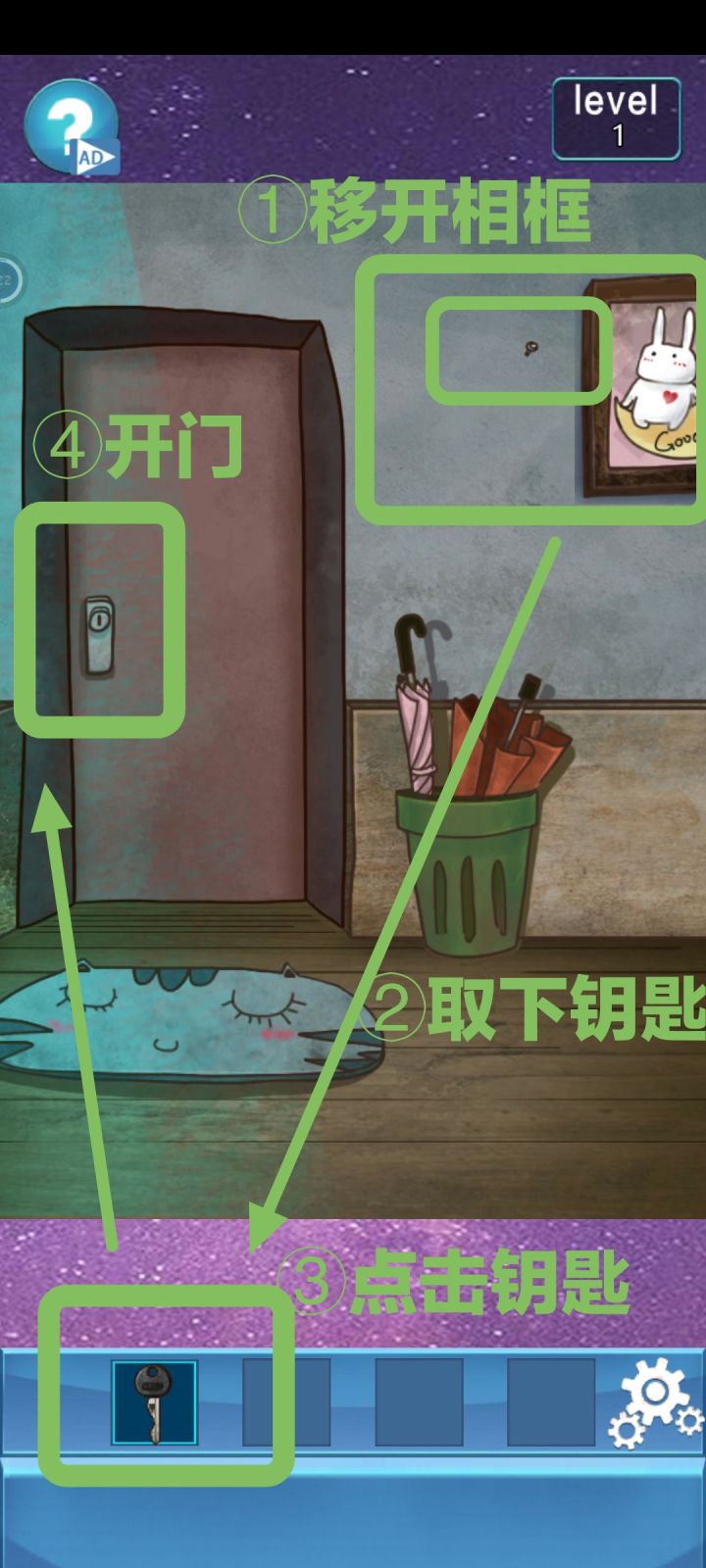 [01-50全攻略][100门]文字版/*****cc 右理者 *****/总体来说这是一个和作者比脑洞契合度的解谜。。此处也参考了论坛上各位大佬的答案,集思广益。现在的版本只有50关,因此目前只有1-50。01. 【钥匙】 在相框背后02. 【4位数字密码门】346803. 【4位数字密码门】按颜色来 463804. 【相框按钮机关】根据大门四个角上1234四个数字的提示,按顺序分
