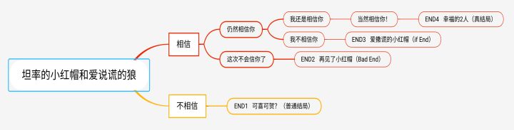 PS:emmm,还真短。PS:建议4结局都触发后看一遍文字版。流程图:文字版:#旁白在很久很久以前。某个小镇上,有一位少女和母亲相依为命。……你问具体是多久以前?这种细节就不要在意啦。总之少女和母亲住在一起。这是一个重点。明白了吗?★「明白了」的选项#旁白很好。我们继续讲故事吧。说到这位少女——★小红帽初次登场#旁白她非常可爱,是个任何人看了都能喜欢的小姑娘。
