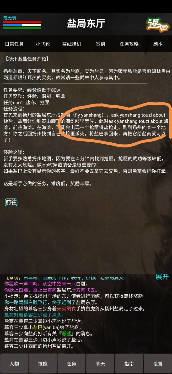 新人的赚钱思路1 东方使者历练挂机12小时4金2签到可能拿到4金3蟒蛇胆15分钟刷新一次 市场价格差不多50 手续费下来拿到手46.5 基本一天10004长安珠宝5金 慕容复5金 采花贼,宋青书等等都有金拿 路过一次刷一次就好5 200w经验开闯王平均一次400金(看福源)6送信一次平均赚150银也就是1.5金7未绑定锦盒开到的东西需求度不高的也可以卖掉比如福源露市场价差不多120