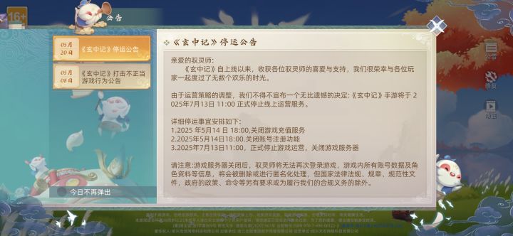 亲爱的驭灵师: 《玄中记》手游自开服以来一直受到广大玩家的支持和关注,为了给所有玩家创造一个公平绿色的游戏环境,《玄中记》运营团队做出以下调整:一、对所有非官方渠道进行下架处理,具体时间安排如下: 1.2024年1月31日关闭注册入口; 2.2024年2月29日关闭充值入口;’ 3.2024年3月31日关闭登录入口。二、官方渠道将继续进行运营,所有官方渠道用户,均可正常进行游戏。您可以
