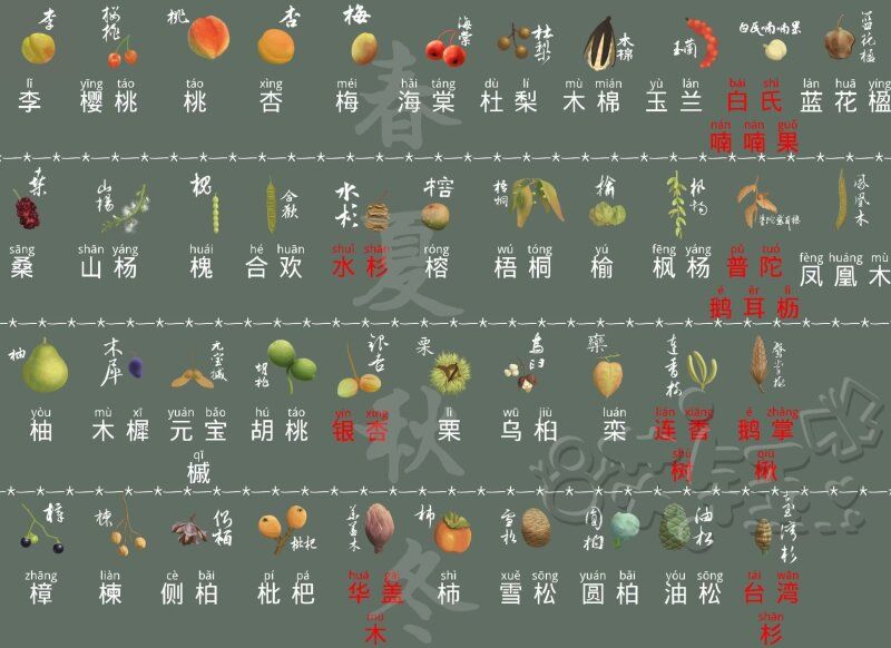 春夏秋冬一共四十种树木!给树种分季节主要是预约需要区分,不用在意这些细节~ 【注:树种变化的情况:换季,进入或退出果期,每个树种都有春,夏,秋,冬,果期五种形态。】 这个帖子的顺序是:树长大后的树形合集,植物笔记,种子图鉴,卡面图鉴。 这些树长什么样的话,可以看这个~ 如果你喜欢有树高对比的纯享版: 现在树种介绍图: 种子图: 每个树种的图鉴: