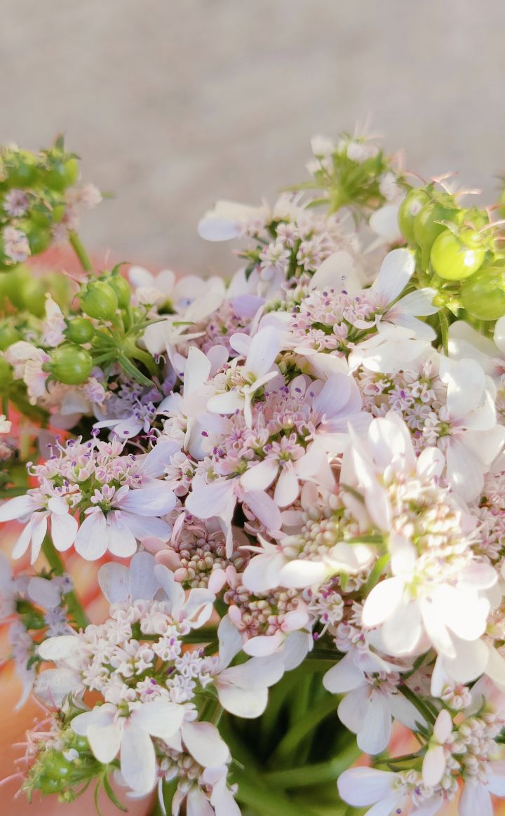 带大家看看香菜的花花掐完香菜,我把它们聚在一起了,花花生长没那么聚拢,我只会说一花一叶,明天评论区补全身好了,其实这些香菜都是长的比较高的夕阳下拍的,还挺好看