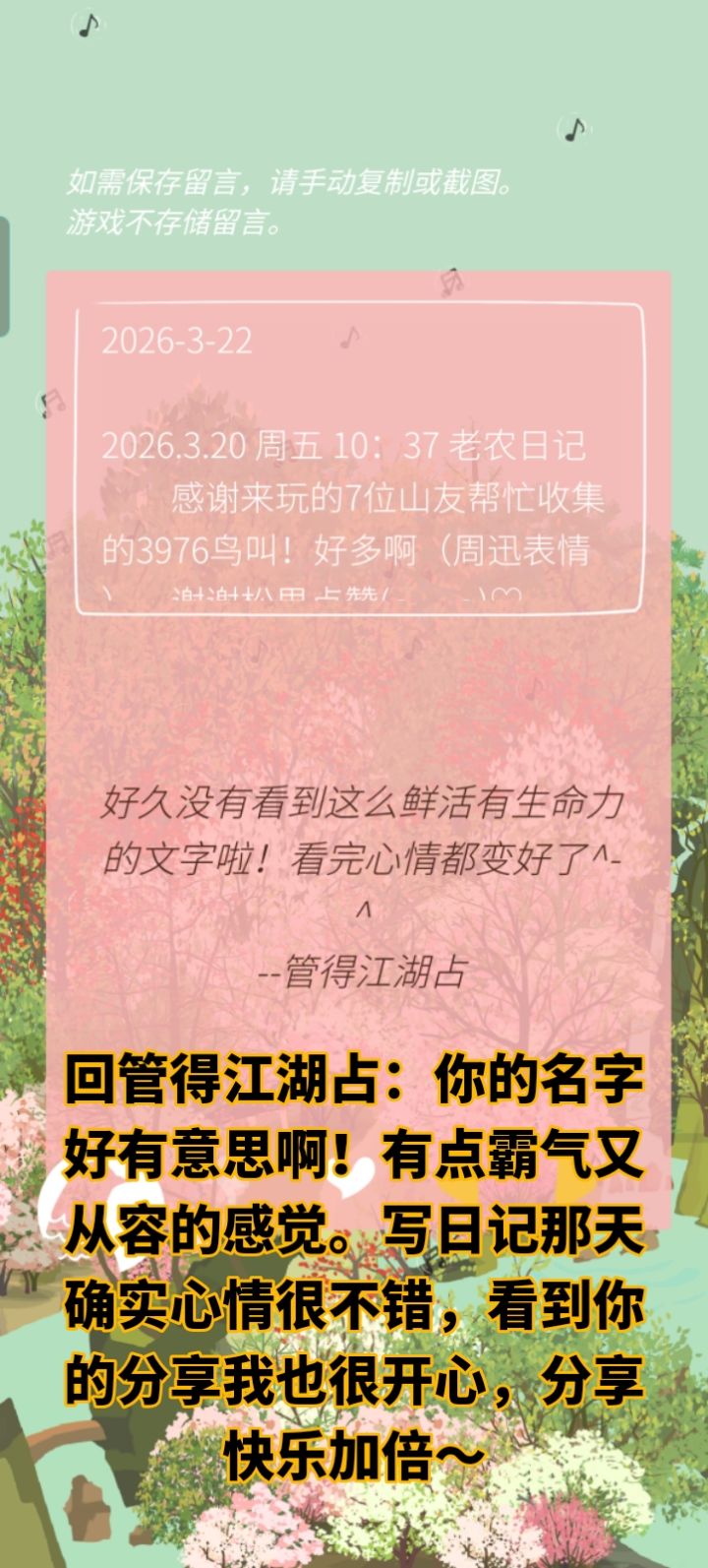 我的记忆太散乱,零零碎碎拼凑出来了我的经历最近心情烦闷,拿着手机无神的翻着,偶然间点开了许久未打开的游戏。熟悉的音乐传入耳海,伴随着淅淅沥沥的鸟叫。这是故事的开篇。活了一年,续了三年缘的海棠。点开一看,是这山头的灶神。
