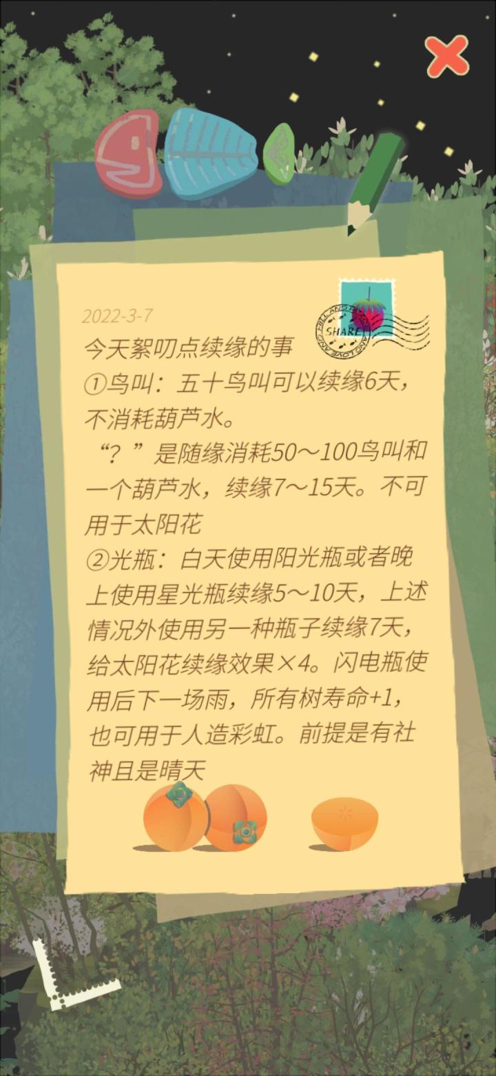 首先,还是和之前一样的抽奖答题种树啦!然后在第三天,你将解锁一些新东西!首先最重要的就是你的树今天应该长大啦!长大的树可以生产鸟叫!就是这个音符!你可以点击音符进行鸟叫的收集!(注:鸟叫只有长大的树才能产生,树苗是没有的嗷~)点了鸟叫后,页面左上角将出现这是你的鸟叫的数目。鸟叫的收集除了自己手动收集,还可以通过“专注模式”收集:鸟叫是续缘道具的一种今天我们就可以开始尝试续缘啦!好