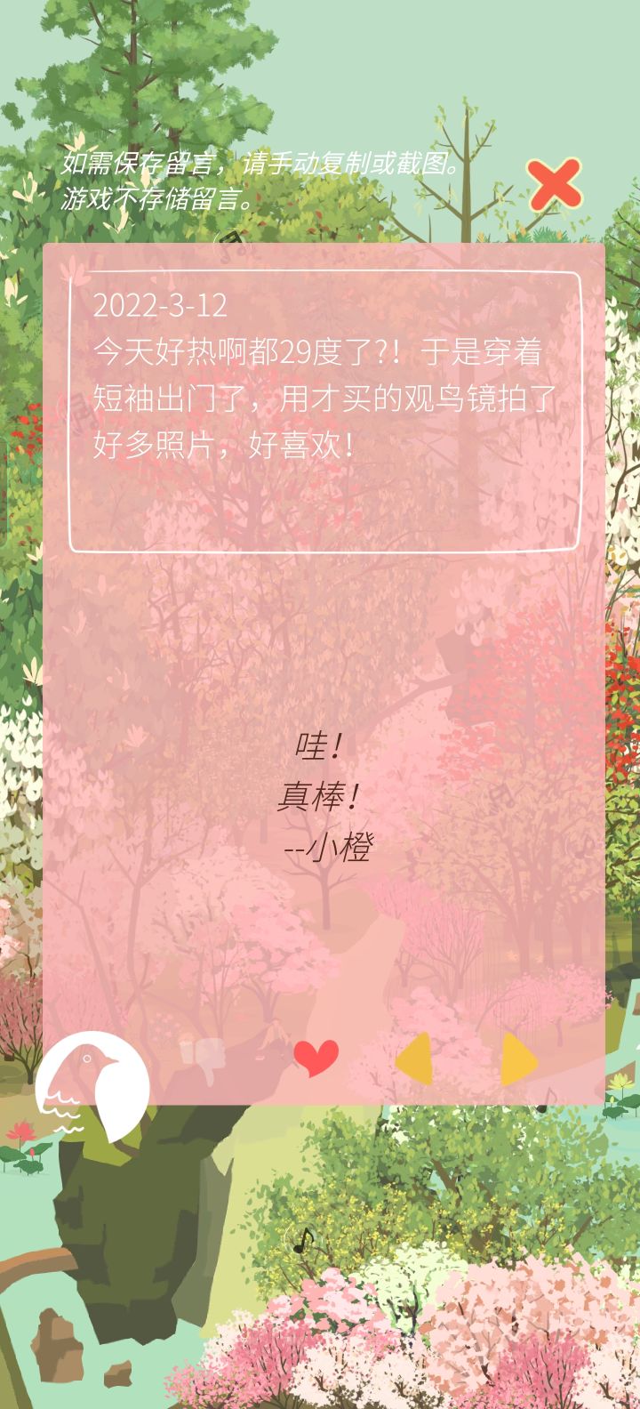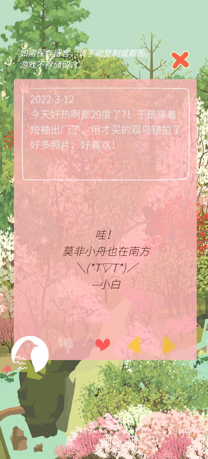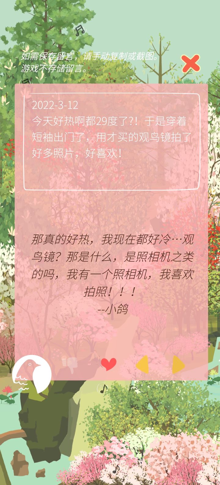 严重剧透警告!!!不爱剧透的不要戳!!!当我第一次看到这个游戏的这个剧情,我觉得它是一个比较悲伤的剧情。因为剧情的背景是,给我们写信的这个主人公,姑且叫他写信人吧,他的爱人去世了,然后他就自己一个人搬回他们两个小时候住着的山上去生活。本来以为这是一个很悲伤的故事,我都准备好纸巾了!但是在开头那一段时间里面我一直看到的却是写信人因为不适应山上的生活,和胡力啊,小毛球啊这些疑似精怪的人一起一起鸡飞