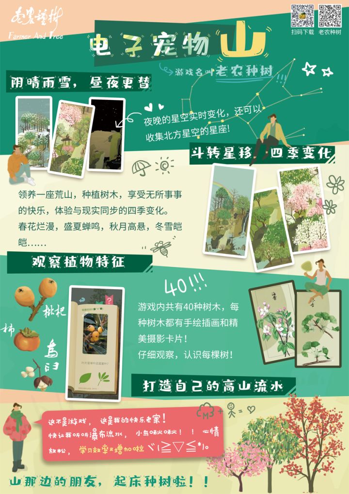 佛系养肝又科普,画风清流易上手。每天上线几分钟,各色种子揣囊中。轻点铲子把树种,等待几天便长成。只需谨记一句话,合理密植很重要。莫忘预约得卡片,答对种子答错水。点点富哥看广告,光或种子你决定。无聊还可肝鸟叫,听听富哥说骚话。老农种树真随缘,闲情逸致云种树。梅桃杏棠樱皆粉,玉兰杜梨李为白。唯有木棉是大红,白氏喃喃证欧皇。晴雨多云时变化,仙树多云云端现。流水鸟叫环境幽,一草一木