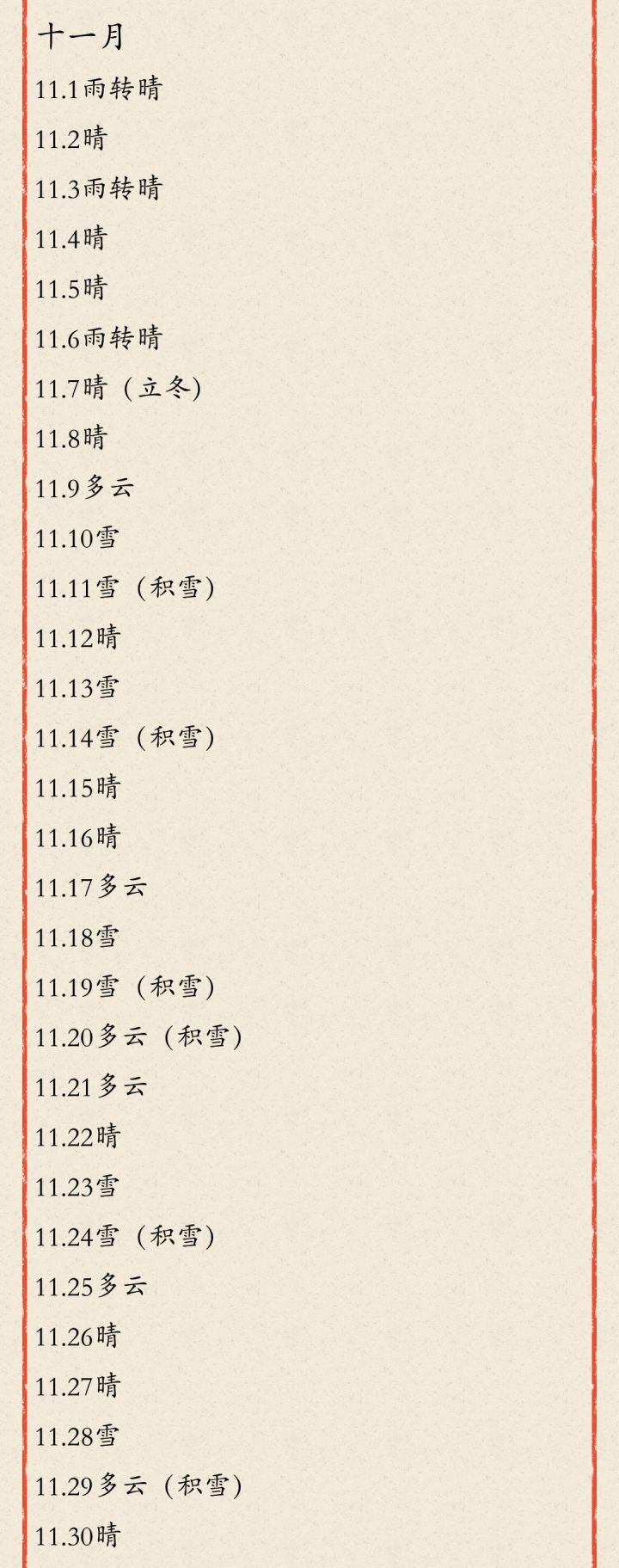 十一月天气统计新鲜出炉啦!
