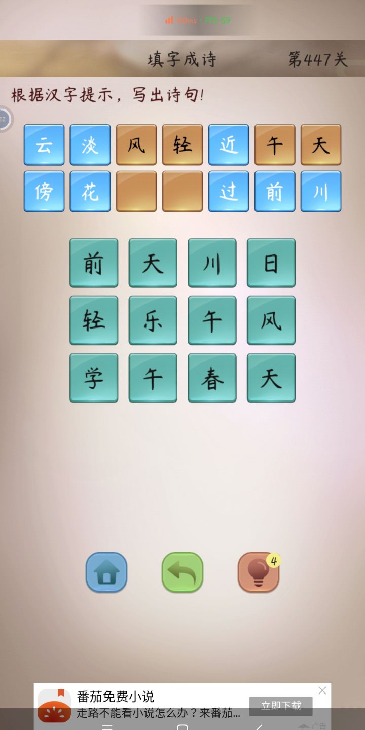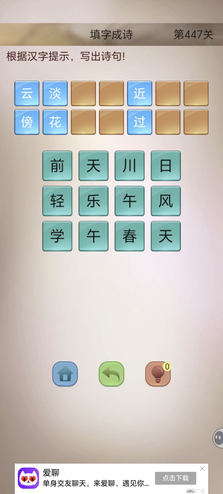 多处错误不提,邮箱反馈点不动,只好评价里来。我是一心想打通关,但是,填字成诗第447关过不去了,其他全过。选项中没有正确的字“随柳”,用提示也没有用,如图。无解,就此停手卸了。本人下载时没有每日答题。