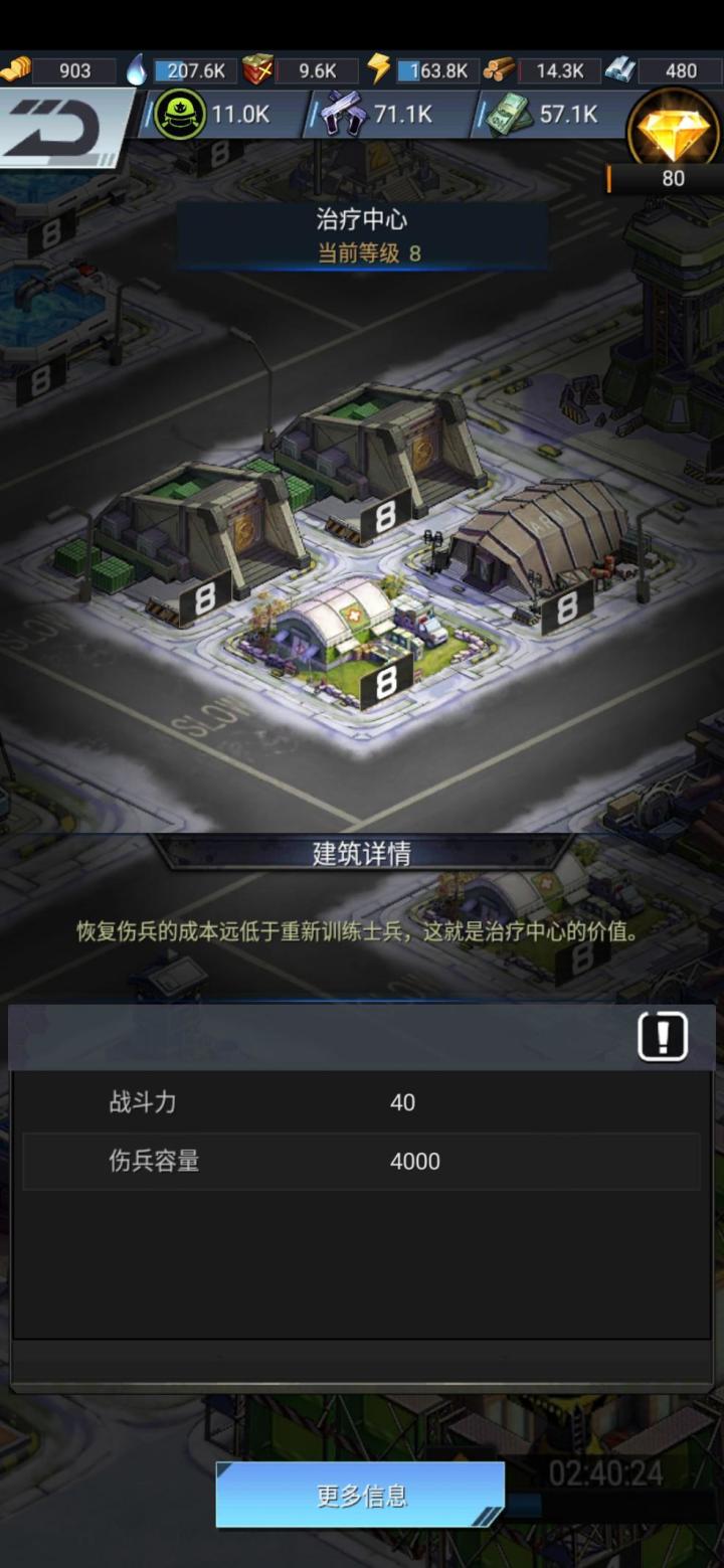治疗中心治疗中心是治疗伤兵的地方,每一次战争中受伤的士兵都会在回到基地后被送往这里。升级治疗中心的等级,可以提升治疗中心的伤兵容量,点击治疗中心-详情-更多资讯,可以获得不同等级的治疗中心对应的伤兵容量。入驻的伤兵越多,恢复所用的资源与时长也就越多。当治疗中心满员后,新的伤兵会直接进入死亡状态。请一定要随时关注治疗中心的等级和伤兵数量,保护好您的部队。玩家也可派遣英雄入驻治疗中心,使用英雄