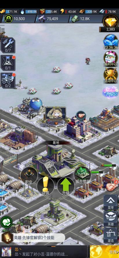 基地基地,是城市的核心建筑物。作为城市的核心建筑,它对城市的发展和增益方面起到至关重要的作用,也能决定玩家的职业发展方向。基地包含有以下几个功能:建筑升级:升级基地的等级可以解锁新的建筑物,并提高已有建筑的等级上限城市增益:可以在城市进攻、防御、资源采集加速方面,消耗道具,对其提供增益战争守护:保护城市不受他人的侦查与攻击攻击加成:增加部队的攻击力防御加成:增加部队的防御力反侦察