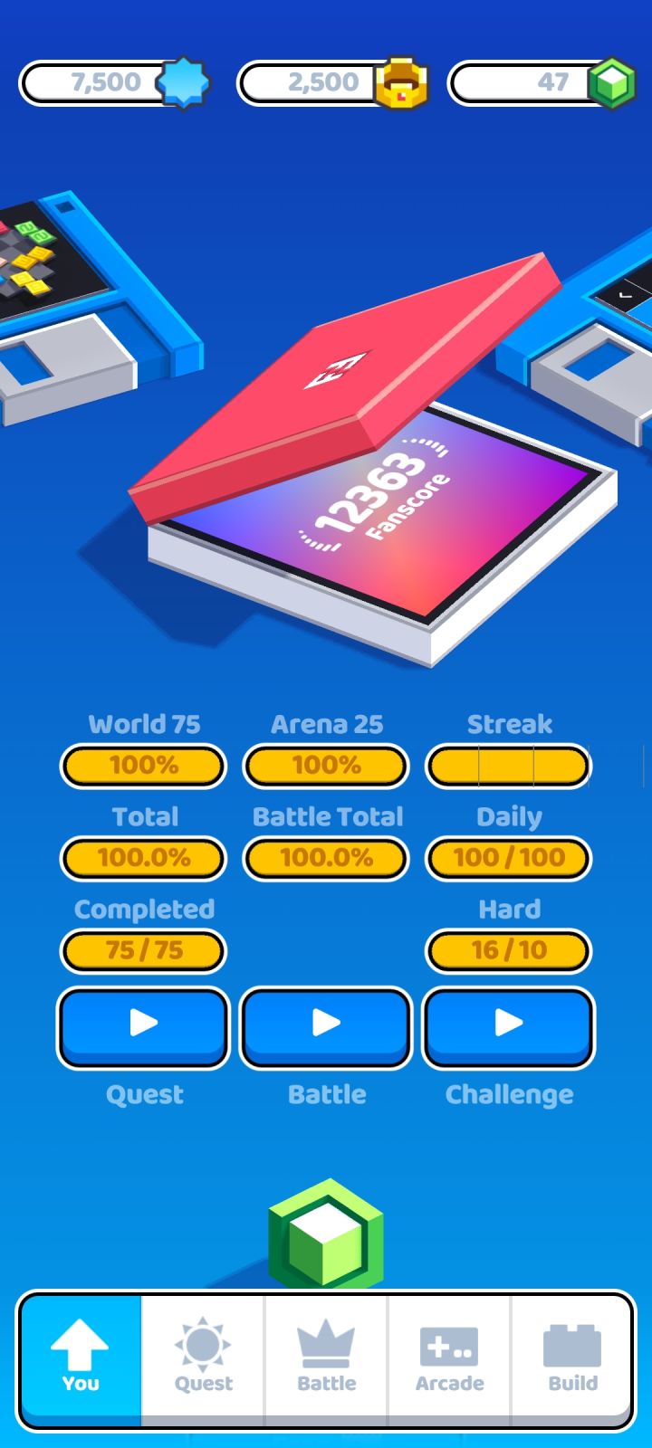 1.13.5版本,总游戏时长超过150小时,Quest模块7500星星全收集、Battle模块100%完成度、每日挑战通关100次打卡!