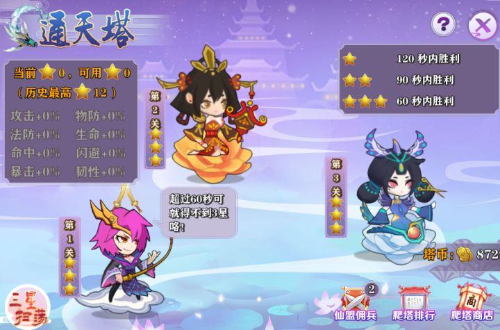 劲爆封神风格手游《飞剑魔斩》即将与大家见面!封神演义,英雄豪杰,吾等终将成神飞升!下面小编为大家带来通天塔玩法,祝你成功登顶,睥睨天下!通天塔可以雇佣一个仙盟好友进行战斗,每天可以雇佣2次。通天塔每通过一关可获得塔币,塔币可以在塔币商店里兑换物品。通过每关会获得星星,每通过3关可以使用当前累计的星星兑换属性,累计的星星到达一定的数量可以解锁塔币商店的奖励。封神手游新纪元,傲世群雄!一切尽在