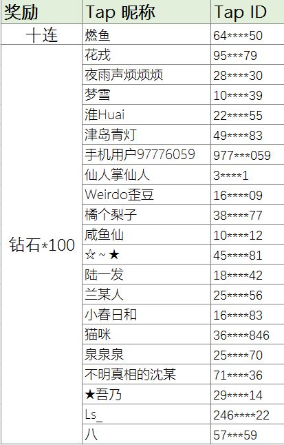 开奖啦~(涉及数量较大,还请制作人们下载原图查看哦~) 非常感谢大家的热情参与!另外可能会有以下情况 ①Tap吞帖未能记录正确天数 ②制作人未填写uid或者uid填写错误 ③连签打卡格式错误 奖励的发放会在7个工作日内完成,实物礼品预计一个月内为制作人们寄出~ 如果制作人对于奖励有疑问,可以联系客服助理君QQ:800039416 提供您的TapID以及UID进行询问哦,她们会为您核实解答哒~(请勿