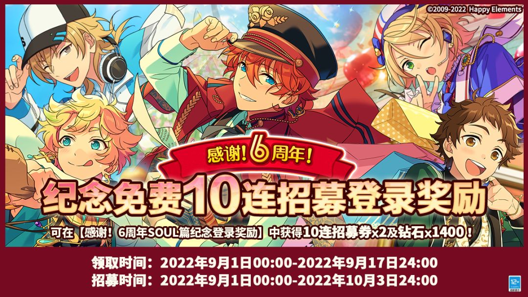 #偶像梦幻祭6周年# 【活动预告】 ★感谢!6周年SOUL篇纪念登录奖励★ 领取时间: 9月1日00:00 ~ 9月17日24:00 作为6周年SOUL篇的答谢,活动期间登录游戏,可领取获得【6周年SOUL篇纪念10连招募券x2】及【钻石x1400】的礼物! 登录内容如下: 第1天,登录即可获得【6周年SOUL篇纪念10连招募券x1】 第2天,登录即可获得【钻石x1400】 第3天,登录即可获得【