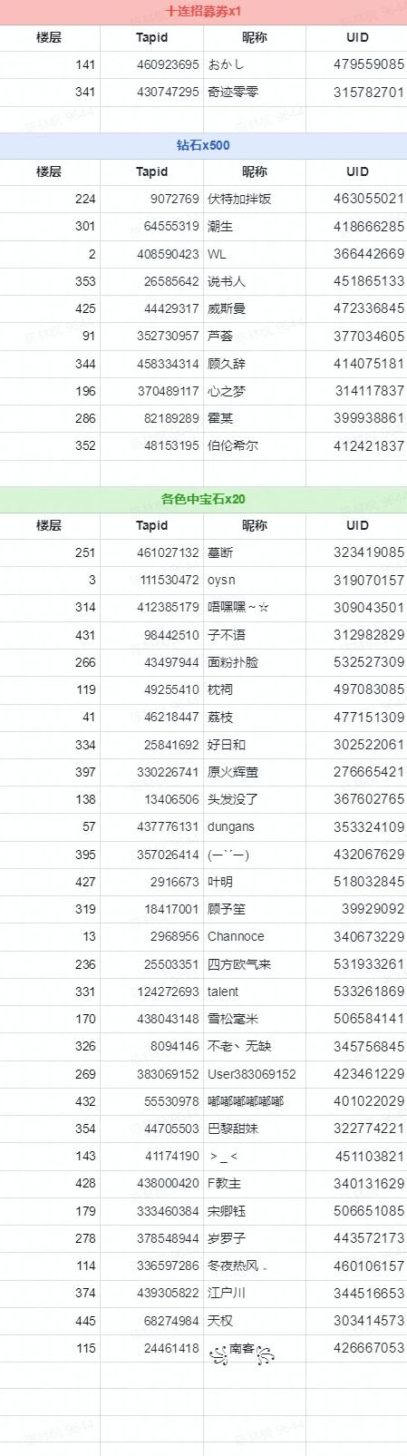 开奖啦~(涉及数量较大,还请制作人们下载原图查看哦~) 非常感谢大家的热情参与!另外可能会有以下情况 ①Tap吞帖未能显示评论 ②制作人未填写uid或者uid填写错误 ③同一TapID多次发送不同UID与截图 奖励的发放会在7个工作日内完成~如果制作人对于奖励有疑问,可以联系客服助理君QQ:800039416 提供您的TapID以及UID进行询问哦,她们会为您核实解答哒~(请勿进行微博私信,提交给