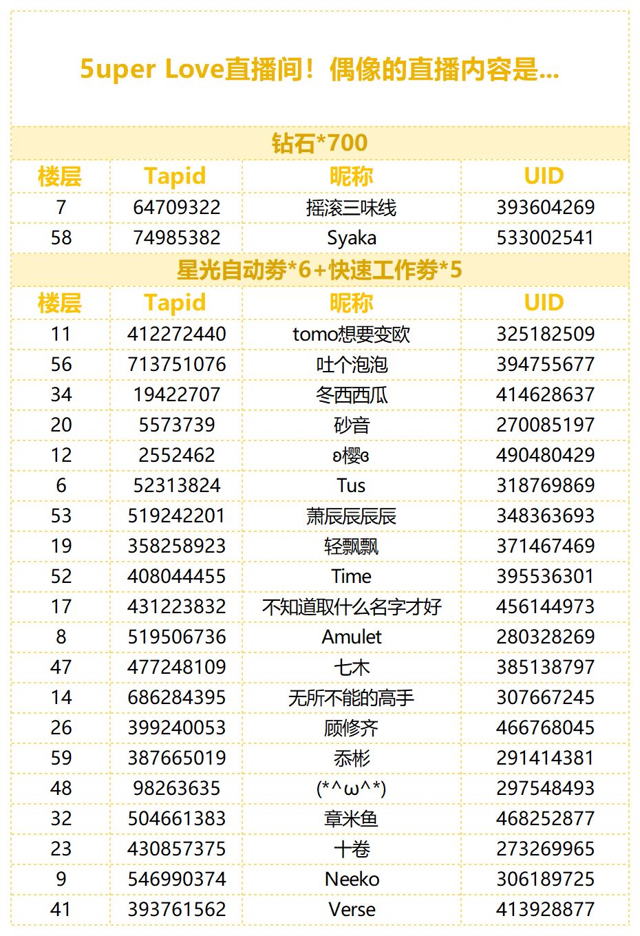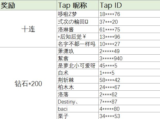 制作人们久等啦,心动厨房挑战中获得奖励的幸运制作人名单如下!感谢制作人们的热情参与!奖励会在稍后按照制作人们填写的uid进行发送,如有任何问题,请联系客服助理君QQ:800039416 提供您的TapID以及UID进行询问哦,她们会为您核实解答哒~(请勿进行微博私信,提交给客服小姐姐处理速度更快哦!) 最后祝大家天天开心,欧气满满~❤ 融化♡心动厨房极难模式挑战已经正式开启! 本次演唱会挑战的谱面