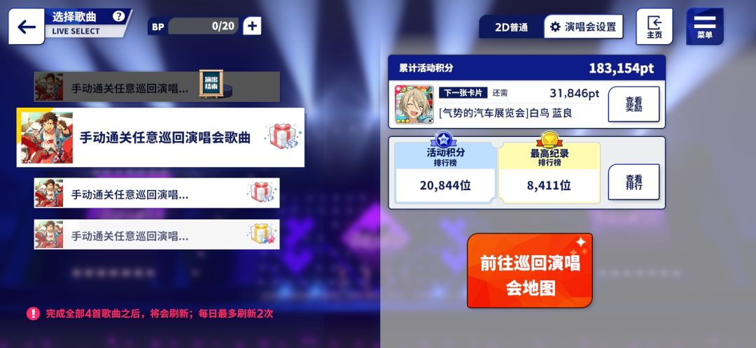 嘶,今天我没看攻略踩了一地的雷,头都要裂了,啧,所以来做个攻略(? 1.第一个就是星光演唱会!兄弟们!因为巡演的星光演唱会是和活动的公演拉在一起了,啧 。 长话短说就是,你得先从星光那点,点进活动公演再打活动公演,打完一轮(四首,又被改到)就再进星光领奖励,我落泪(就是那个进入巡演地图) 2.就是活动30关可嫖一张五星,活动线是300w一彩五星卡,350w虎子五星卡,一彩是蓝卡,虎子是红卡,都不是