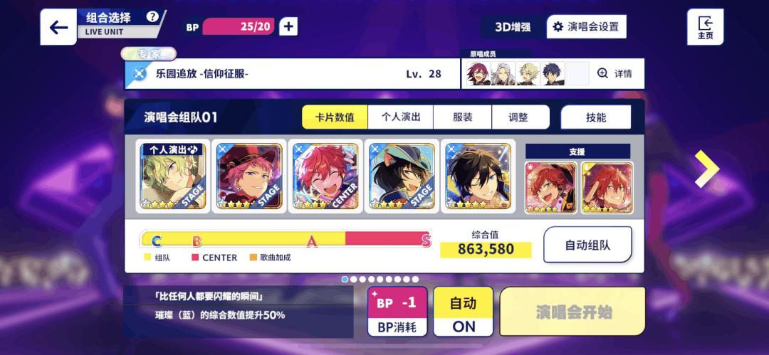 演唱会开始前把自动模式从OFF调为ON的状态即可开启自动打歌,而自动打歌分为免费自动打歌和付费自动打歌两种。 免费自动打歌 在普通演唱会或者星光闪耀演唱会打完一首歌达到Full Combo时就能解锁这首歌对应难度的免费自动打歌,所以每个难度的免费自动打歌解锁都需要手动刷一次FC,不同的是,虽然星光闪耀演唱会能解锁甚至是更新自动打歌的FC的判定,但是星光闪耀演唱会却不能自动打歌。 付费自动打歌 针对