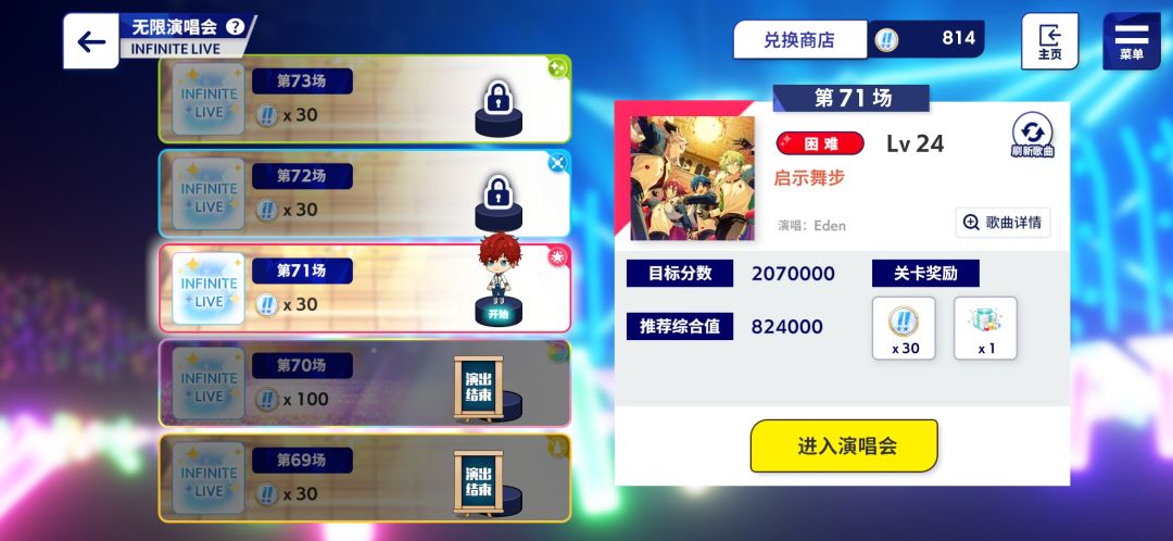 纪念,无限演唱会70场达成! 挖矿篇 ① 如下图所见,完成次数A评价(20次)得1大矿,困难连击次数A评价得1大矿,专家得2大矿(大矿颜色好像是会更替的 打不过困难专家不妨调小音符调慢速度试试,比较容易全连(我调的是音符大小70%,速度6.7 ②无限演唱会70场商店上架300大矿中矿小矿(现在缺的是小矿了,哭 69层黄色我用的是4红色同属五星+1绿色五星,偶像之路几乎全开,困难手打勉强过(打不过可