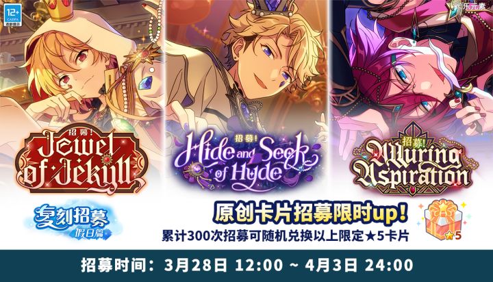 亲爱的制作人们: 现在助理君为大家播报「复刻招募!假日篇」情报。※开放时间:3月28日12:00~4月3日24:00※「招募!Jewel of Jekyll」、「招募!Hide-and-seek of Hyde」、「复刻招募!Alluring Aspiration」中UP卡片将同时在「复刻招募!假日篇」进行UP。复刻内容:「招募!Jewel of Jekyll」:★5【烈阳绯色】仁兔