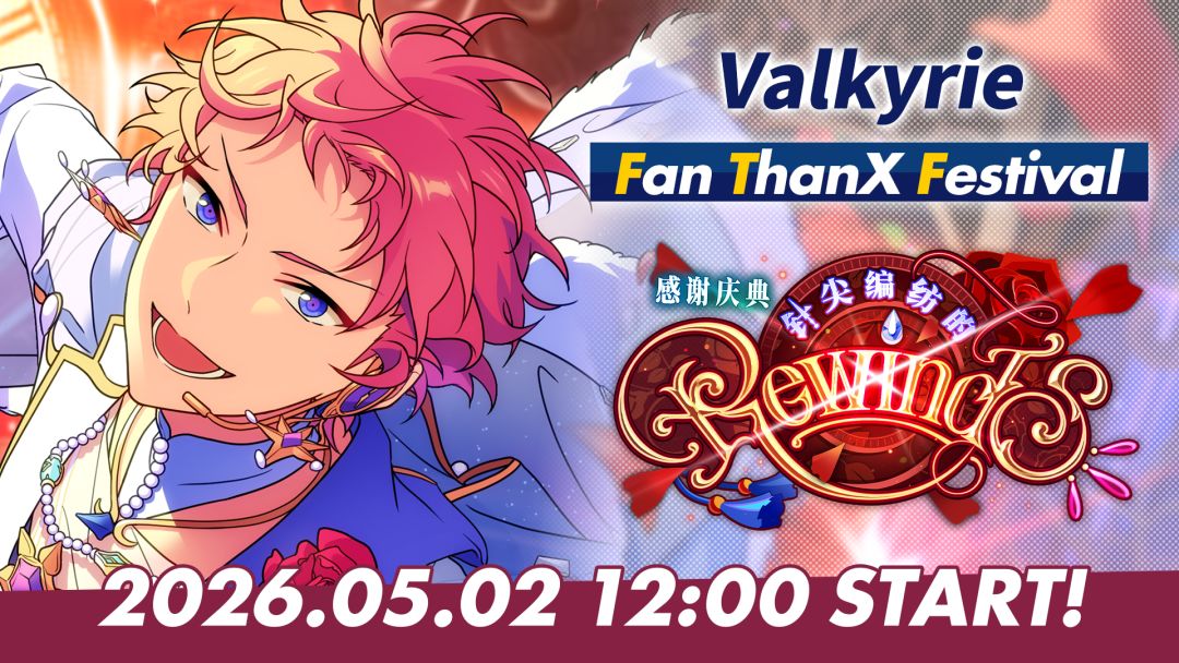 【活动预告】 『来 一同继续镌刻时光吧 为「Valkyrie」编纺而成的爱之轨迹 以美收针结线吧』 宗提议从零开始设计建造「瓦尔赛宫殿」,邀请粉丝共赴艺术与音乐的盛宴,以此作为「Valkyrie」的感谢庆典。然而,企划却被不由分说地要求缩小规模,于是宗开始和美伽一起思考什么样的内容最为合适。 5月2日,「感谢庆典◇针尖编纺的Rewinds」开启!