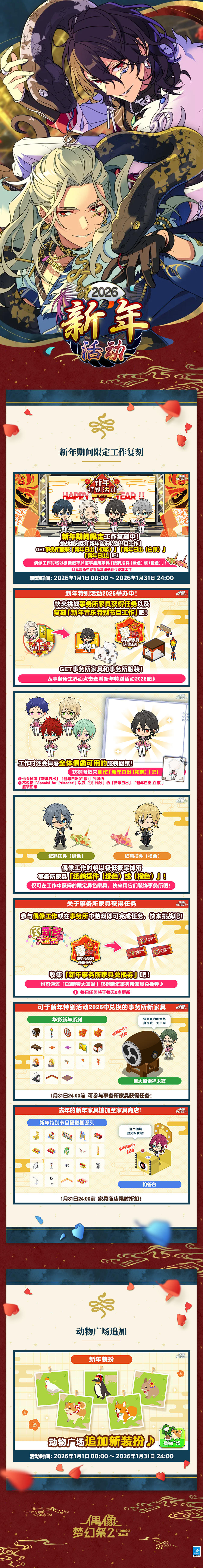 元旦·「新年特别活动2026」即将开启!★「新年特别活动2026」★活动时间:2026年1月1日00:00~1月31日24:00活动期间,挑战事务所家具获得任务和「新年音乐特别节目」工作,收集「新年事务所家具兑换券」,兑换事务所家具【华彩新年系列】吧♪家具兑换截止时间:2026年1月31日24:00※「新年事务所家具兑换券」也可以通过「ES新春大富翁」获得♪★新年限定工作【新年音乐特别
