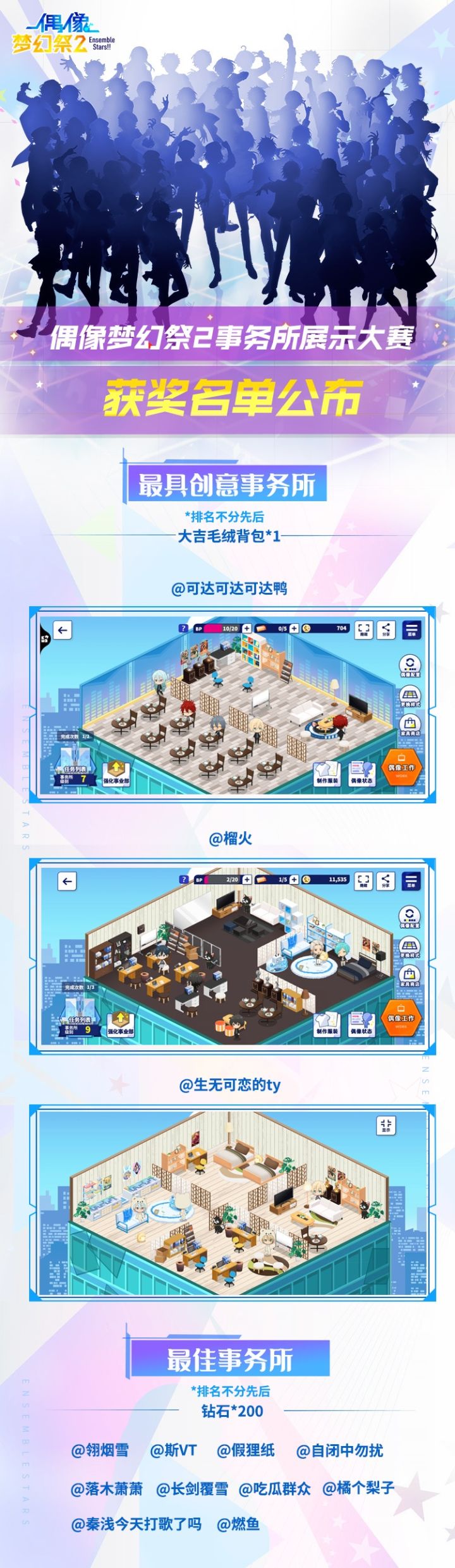 《偶像梦幻祭2》TapTap 第一届事务所展示大赛获奖名单公布!非常感谢大家的积极参与,每一份作品都饱含了制作人们的努力和心意。根据活动规则我们筛除部分不符合参赛要求的作品后,最终选出以下【最具创意事务所】和【最佳事务所】~具体可见下图。本次活动奖励将于1月25日起陆续发放哒~让我们一起期待第二届的事务所展示大赛吧!(๑•̀ㅂ•́)و✧