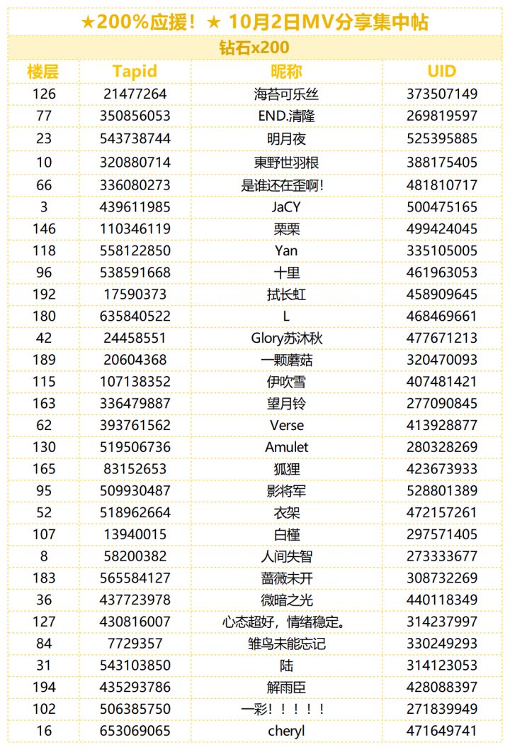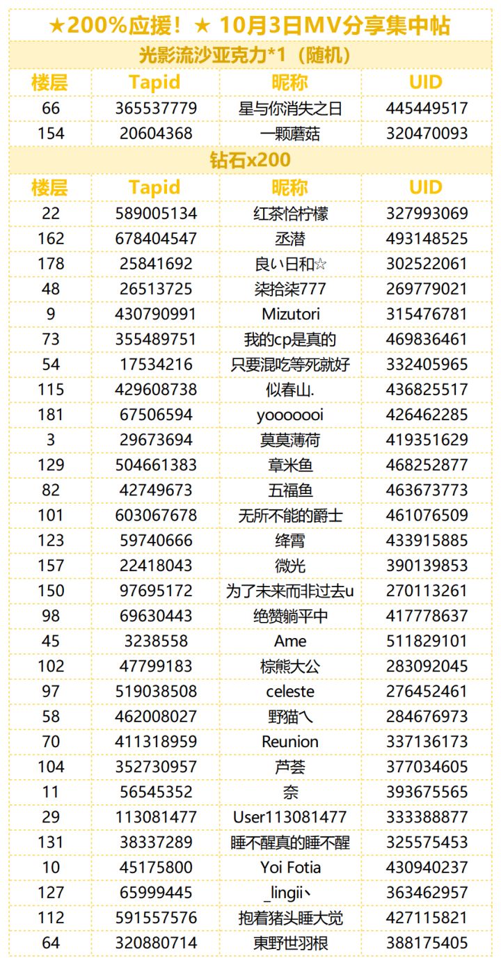 制作人们久等啦,让我们恭喜以下幸运的制作人们!助理君已统计全部正常显示楼层与图片,奖励会在7个工作日内发放到制作人的礼物盒中,礼物盒内奖励保存期限为10天,请注意查收~!【今日MV分享】今日的歌单,是让人绽放元气的歌单!请制作人们在本帖的评论区分享喜爱的3D MV截图,并附上正确的游戏UID。无论是普通/协力演唱会,还是鉴赏模式都可以哦~符合以上内容视为成功参与今日活动~【活动奖励】助