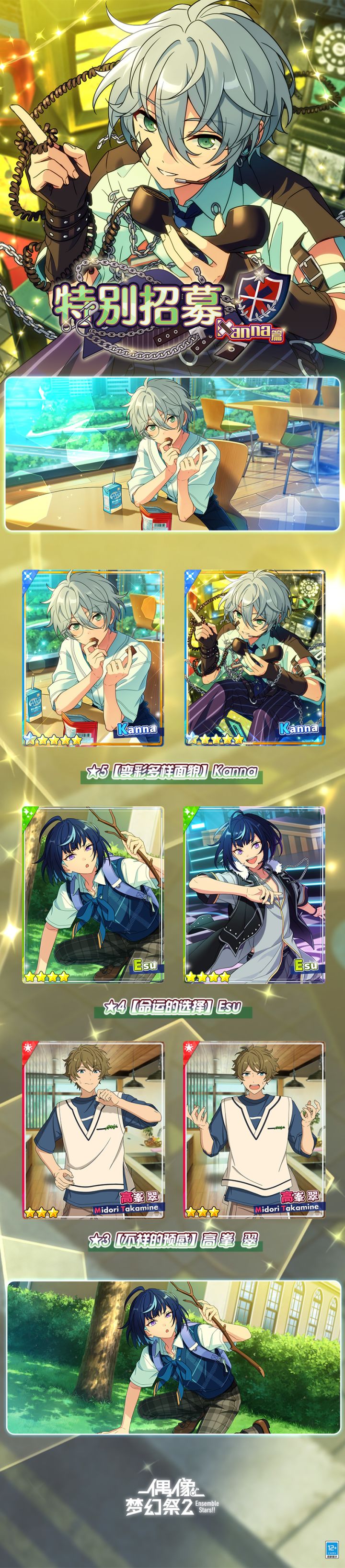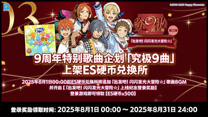 8月1日00:00起ES硬币兑换所将追加「出发吧!闪闪发光大冒险☆」歌曲BGM 请欣赏:究极9曲系列-「出发吧!闪闪发光大冒险☆」 演唱者:明星昴流、椎名丹希、仁兔成鸣、天满光、葵裕太