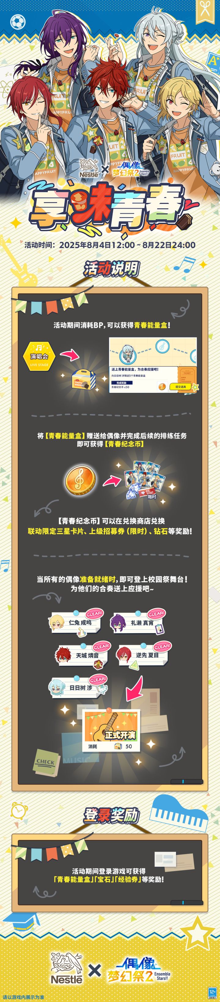 【偶像梦幻祭2 x @雀巢中国 联动PV公开】 《偶像梦幻祭2》 x 雀巢中国「享味青春」联动活动即将开启! 游戏活动时间:2025年8月4日12:00~8月22日24:00 为偶像们的合奏送上应援吧♪