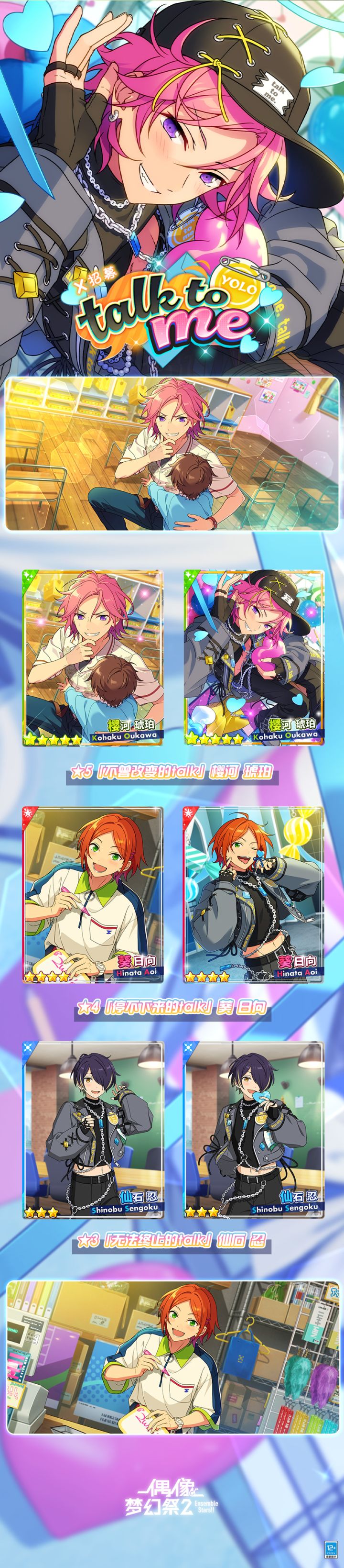 现在助理君为大家播报「X招募・talk to me/YOLO」情报。 一、「X招募・talk to me/YOLO」限定卡池内容如下: ※ 开放时间:7月7日12:00~7月21日12:00※ 本期登场的角色:★5【不曾改变的talk】樱河 琥珀★4【停不下来的talk】葵 日向★3【无法终止的talk】仙石 忍※ 以上卡片,会在限定卡池掉率提升。同时在【实现*第2次许下的Wis
