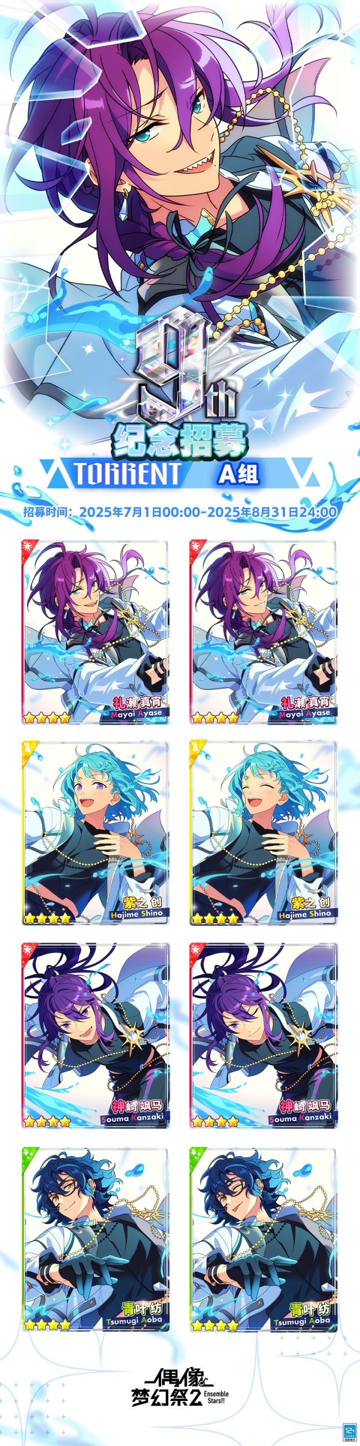 【活动预告】⭐9周年纪念招募TORRENT季度A组⭐招募时间:2025年7月1日00:00~8月31日24:00登场的偶像为:★4 【暗涌的TORRENT】礼濑 真宵★4 【优雅的TORRENT】紫之 创★4 【迅速的TORRENT】神崎 飒马★4 【心中的TORRENT】青叶 纺*10连必得2张及以上TORRENT季度A组9周年纪念限定卡片