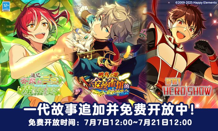 7月7日12:00~7月21日12:00期间,游戏内将免费公开「ES」一代活动剧情故事:「追忆*齐聚的三位魔法使」、「鸣鸟之歌*金丝雀馆的夜场歌会」、「招募!HERO SHOW」活动结束后未阅读的故事需要消耗钻石或ES回忆钥匙进行解锁阅读。同时部分一代故事按照运营排期会随着对应组合或关联再次开启免费开放,具体内容请关注后续官方公告。 欢迎各位制作人前来阅读♪
