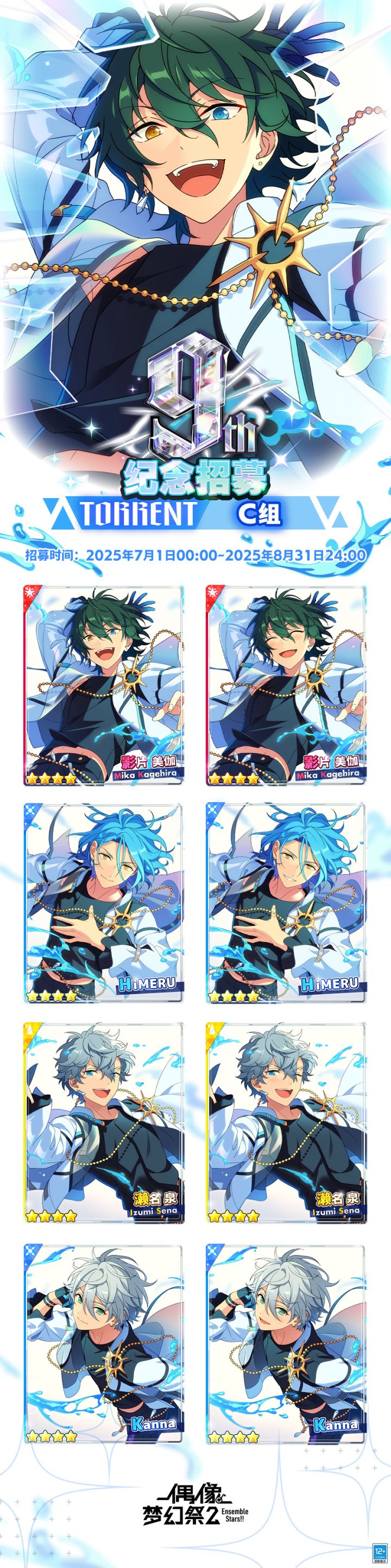 【活动预告】⭐9周年纪念招募TORRENT季度C组⭐招募时间:2025年7月1日00:00~8月31日24:00登场的偶像为:★4 【形态不定的TORRENT】影片 美伽★4 【完美的TORRENT】HiMERU★4 【不停歇的TORRENT】濑名 泉★4 【孱弱的TORRENT】Kanna*10连必得2张及以上TORRENT季度C组9周年纪念限定卡片