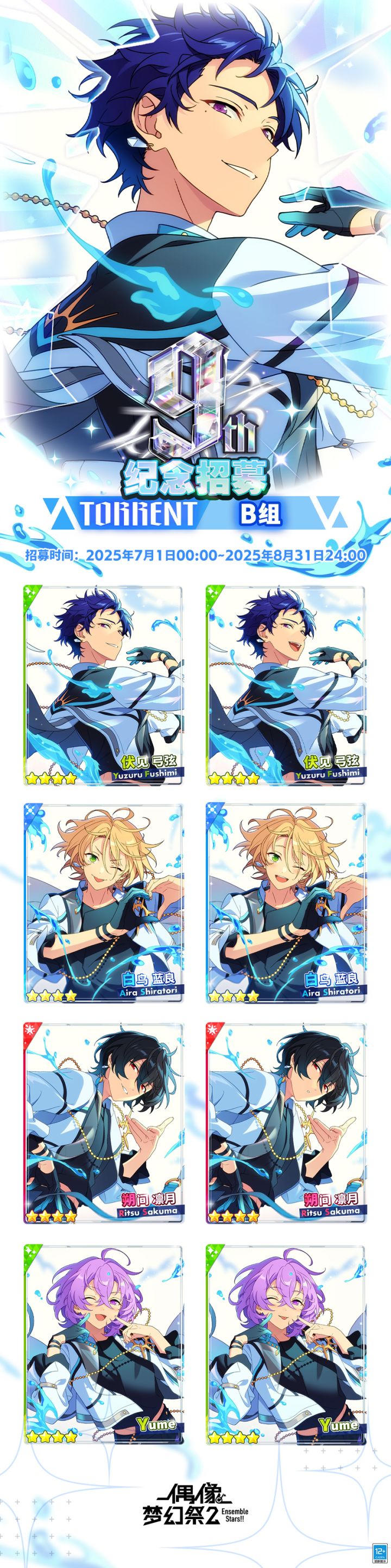 【活动预告】⭐9周年纪念招募TORRENT季度B组⭐招募时间:2025年7月1日00:00~8月31日24:00登场的偶像为:★4 【静静的TORRENT】伏见 弓弦★4 【飞溅的TORRENT】白鸟 蓝良★4 【低语的TORRENT】朔间 凛月★4 【自我的TORRENT】Yume*10连必得2张及以上TORRENT季度B组9周年纪念限定卡片