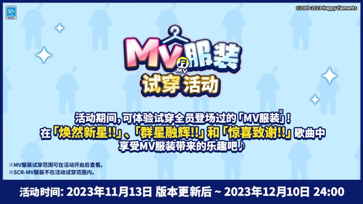 周年预告|MV服装试穿活动 11月13日版本更新后~12月10日24:00期间,将开启MV服装试穿活动。 活动期间,可体验试穿全员登场的「MV服装」。在歌曲「焕然新星!!」、「惊喜致谢!!」、「群星融辉!!」中享受MV服装带来的乐趣♪活动期间制作人可以将自己自己喜欢的组队分享至微博#ES2三周年服装试穿#下,分享量达到1W时,全服制作人将获得【MV服装结晶*2】!※具体MV服装试穿范围