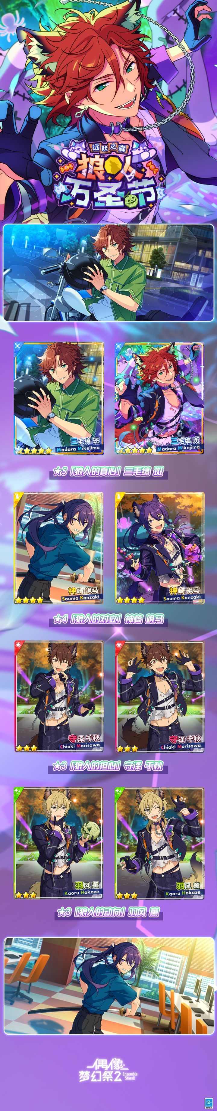 「远吠之森★狼人万圣节」将于3月22日开启 斑为了乘势而上、踏出「MaM」的全新一步而干劲十足。当希望与关系一直有些尴尬的「制作人」一起完成大型企划时,他发现了上个年度废弃的企划书。 请欣赏本期活动歌曲MV—— 「万圣夜会」-MaM