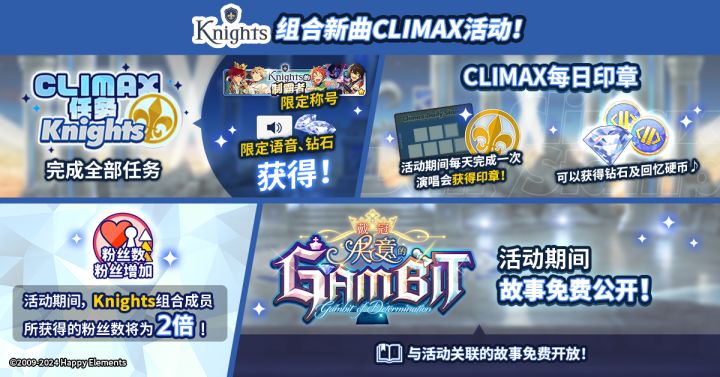 「戴冠◆决意的GAMBIT」将于7月27日开启 ES成立的第一年度春天。从新生那里收到了「组合」加入申请,身为新一任「王」的司干劲十足。本以为接下来的偶像活动会一帆风顺,却出现了酷似「Knights」的冒牌货,事态朝着意想不到的方向发展—— 请欣赏本期活动歌曲MV—— 「光辉王冠」-Knights