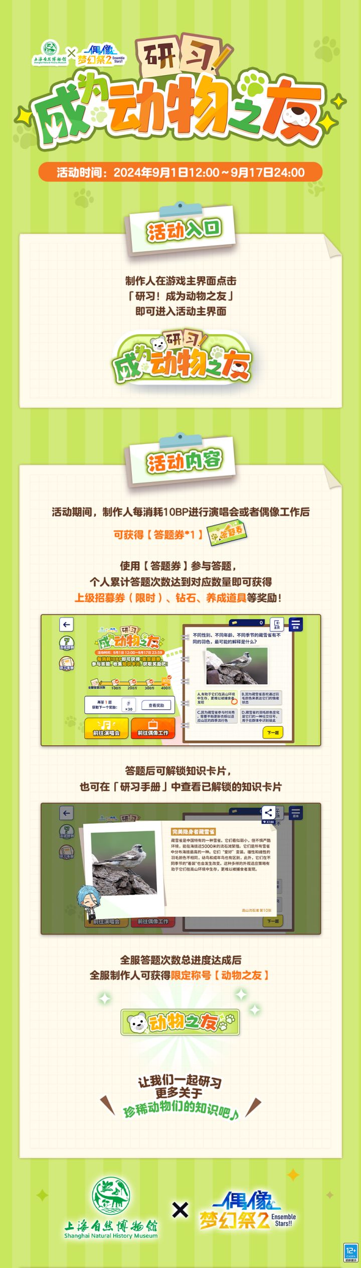《偶像梦幻祭2》 × 上海自然博物馆 三江源珍稀动物保护公益活动启动!本次公益活动「研习!成为动物之友」由《偶像梦幻祭2》与上海自然博物馆联合发起活动时间:9月1日12:00 - 9月17日24:00活动入口:制作人在游戏界面点击「研习!成为动物之友」即可进入活动界面活动内容:▶活动期间,制作人每消耗10BP进行演唱会或者偶像工作后可获得【答题券*1】,使用【答题券】参与答题,个人累